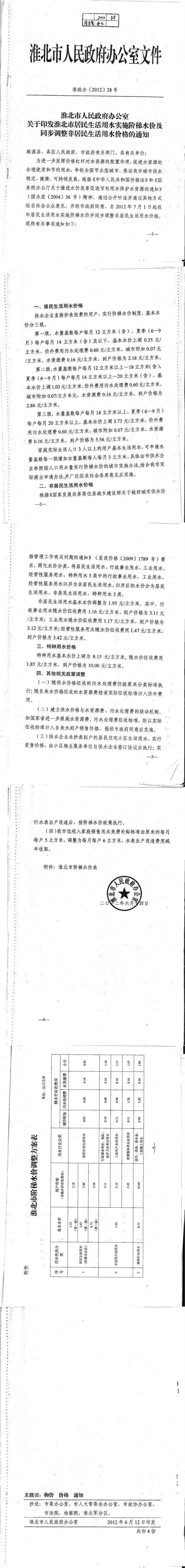 淮北市人民政府關(guān)于印發(fā)淮北市居民生活用水實施階梯水價及同步調(diào)整非居民生活用水價格的通知 淮政辦【2012】28號