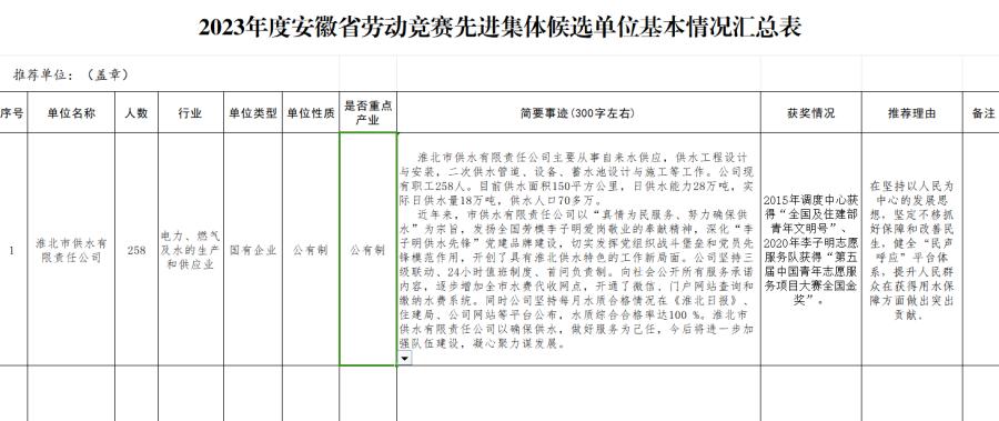 根據(jù)省總工會《關(guān)于推薦評選 2023 年度安徽省勞動競賽先進(jìn)集體、先進(jìn)個人和省五一勞動獎、省工人先鋒號的通知》(皖競字〔2024〕1 號)文件精神,現(xiàn)對申報單位供水公司予以公示。