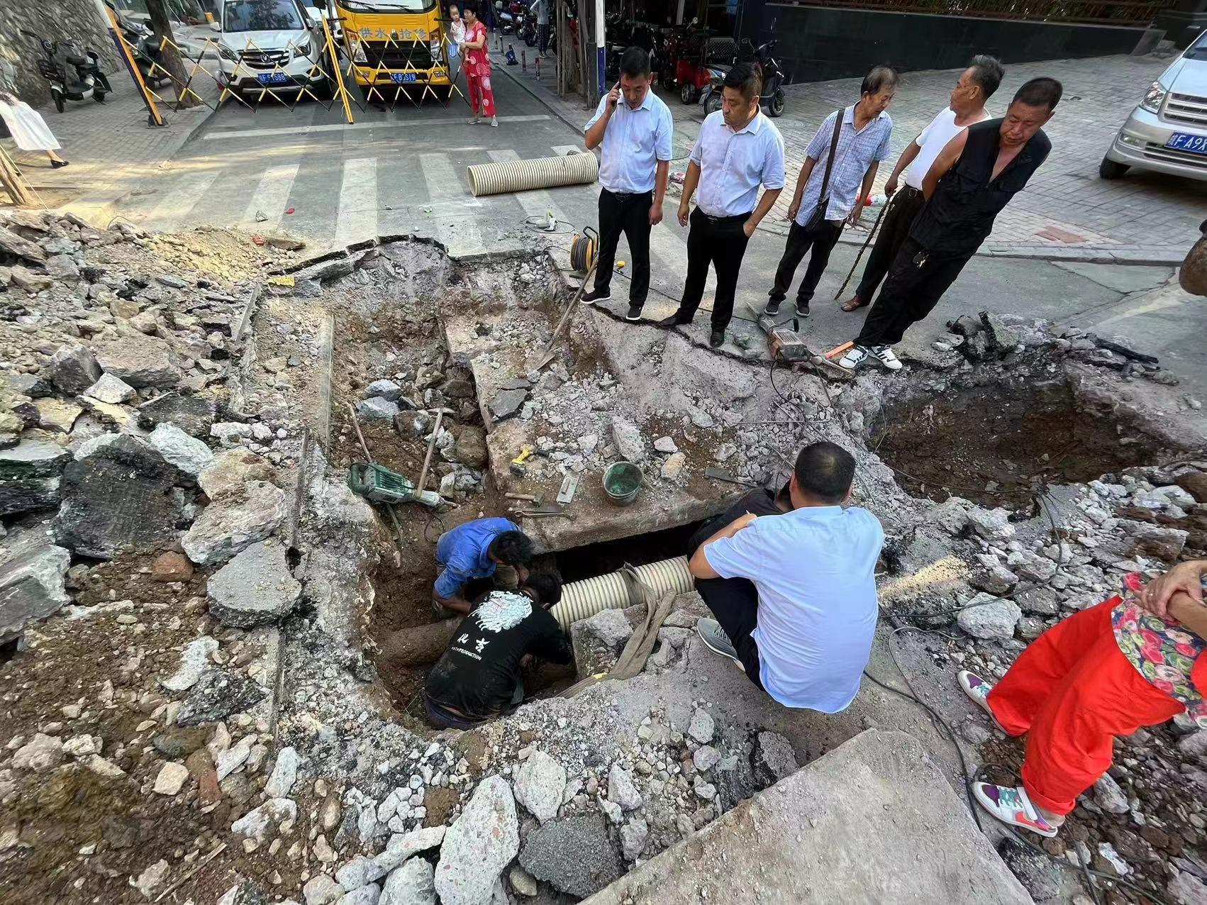 管網(wǎng)部立即對漏水點展開了搶修工作,漏水點在環(huán)山西路中間位置。為了過往車輛和施工人員的安全,立即匯報至交警部門,得到批準后對環(huán)山西路進行了封路。搶修工人頂著高溫天氣,經(jīng)過8個小時的奮戰(zhàn),終于將漏水管道修復完成,確保了居民正常用水。晚上21時,清運多余的余土和開挖溝槽的回填,恢復環(huán)孟西路正常通行。8月18日凌晨1時,瀝清路面恢復完畢,開始清掃、沖刷開挖處路面的污垢。直至凌晨3時,搶修工作全部完成。